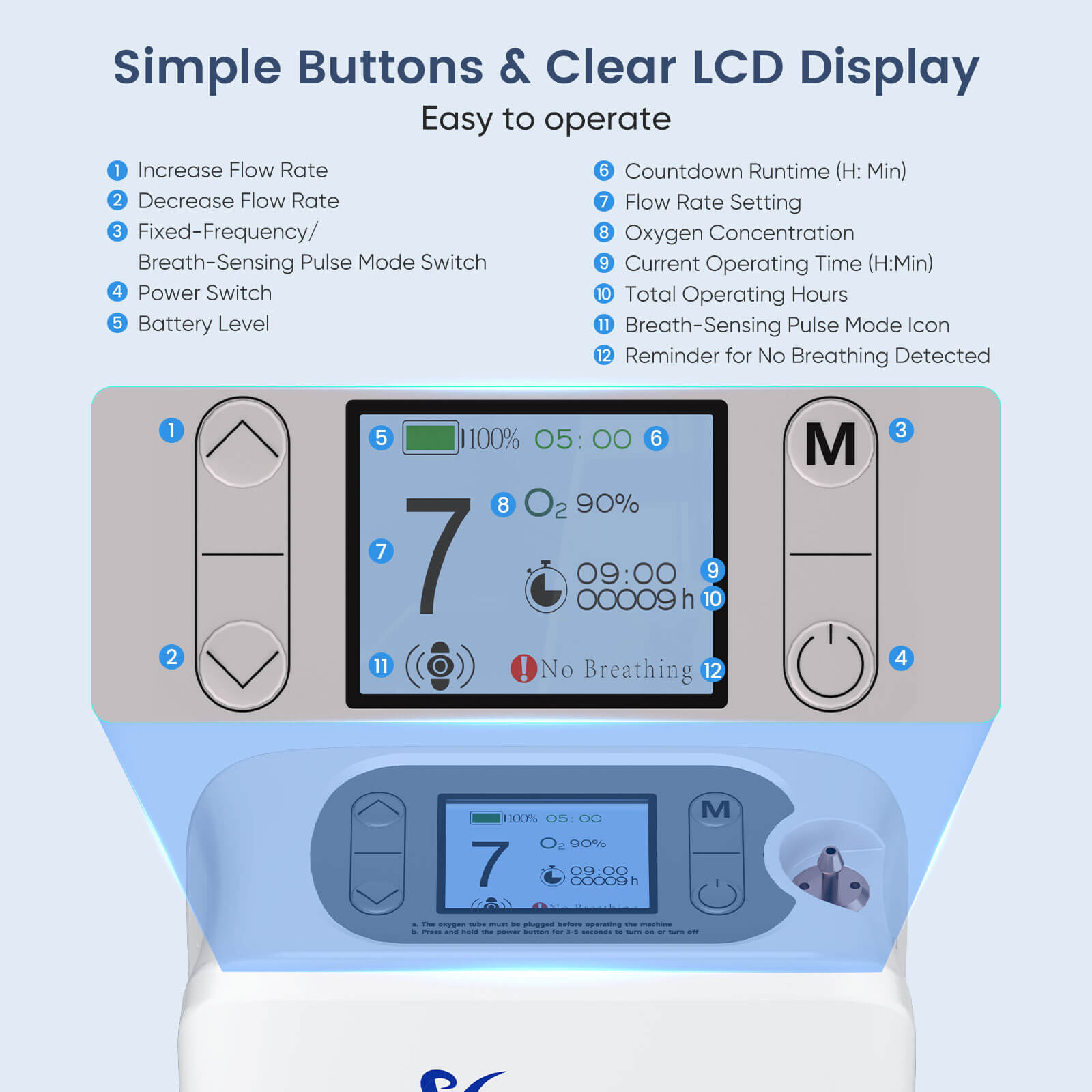 Clear, backlit LCD display for easy monitoring of settings, oxygen concentration, battery life, and remaining runtime. Designed for simple operation, perfect for seniors.
